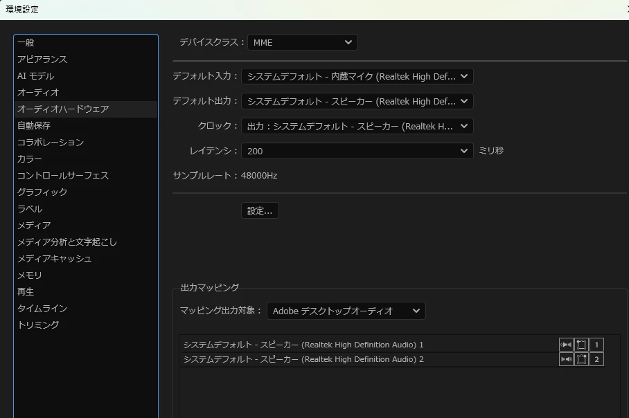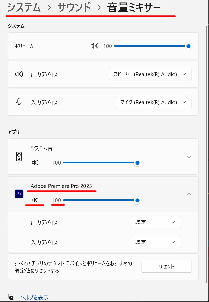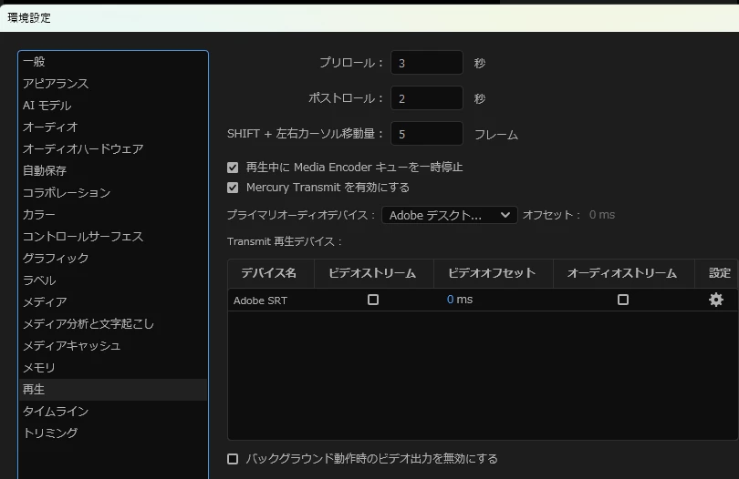 キャッシュを削除したり、ミュートを確認したり、「スクラブ中にオーディオ再生にチェック」がされているか確認しました(2025ではそういった表示ではなくなり「Mera・・trancフィット?を有効」になっているようですね)ハードウェアを変更してみたのですが再生されません。