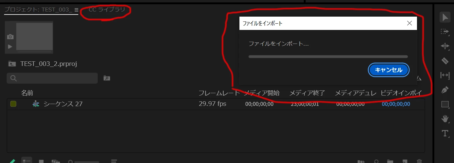 ワークスペース上から右クリックでファイルを読み込もうとすると「ファイルをインポート」のダイアログが出たまま進まない状態になります。