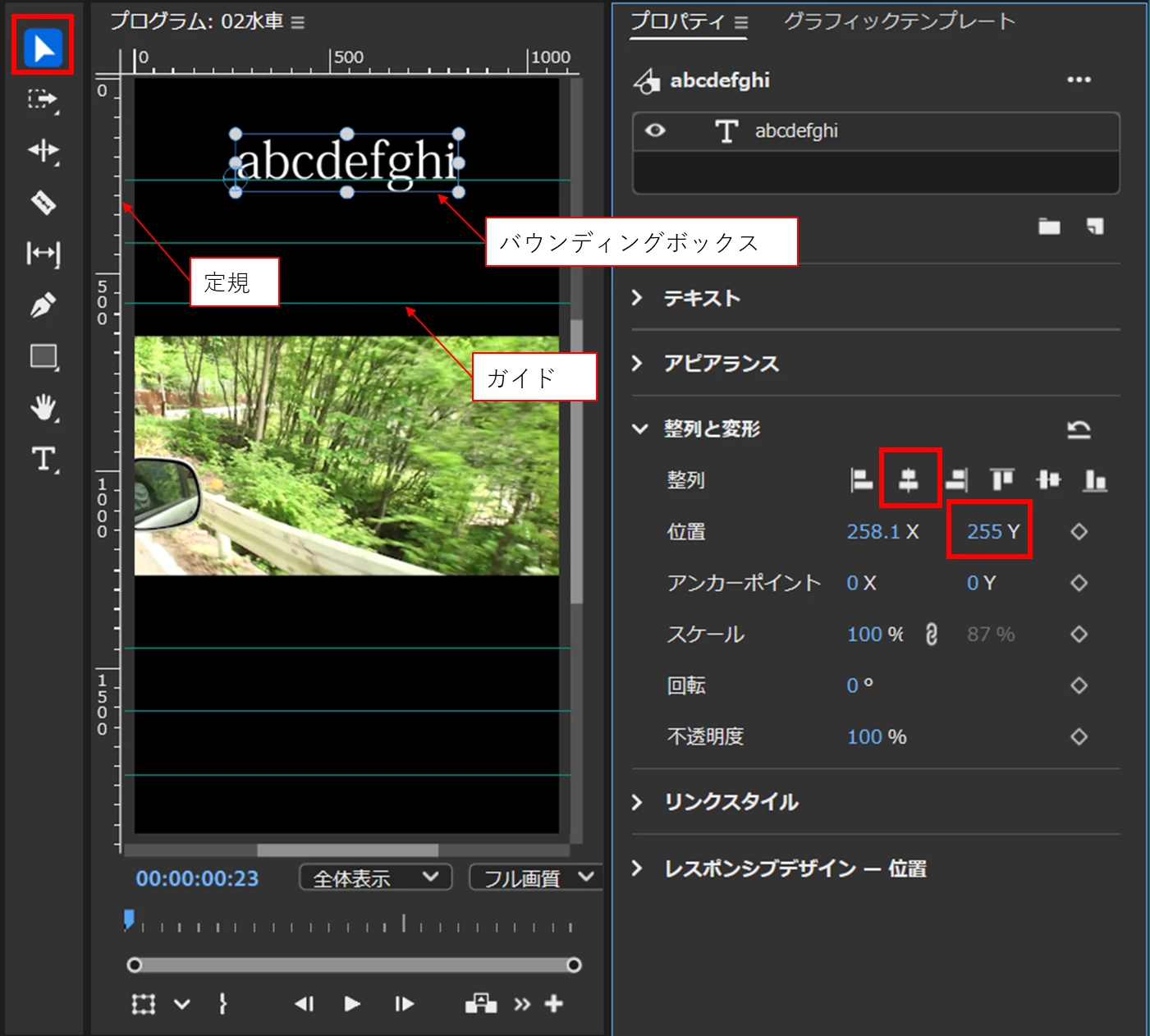 ②「横書き文字ツール」から「選択ツール」に持ち替えると「バウンディングボックス」が表示されます。「整列と変形」項の「水平方向に中央揃え」アイコンをクリックして水平方向中央に移動し、「位置」の「Y」数値で上下方向を「ガイド」に合わせます。