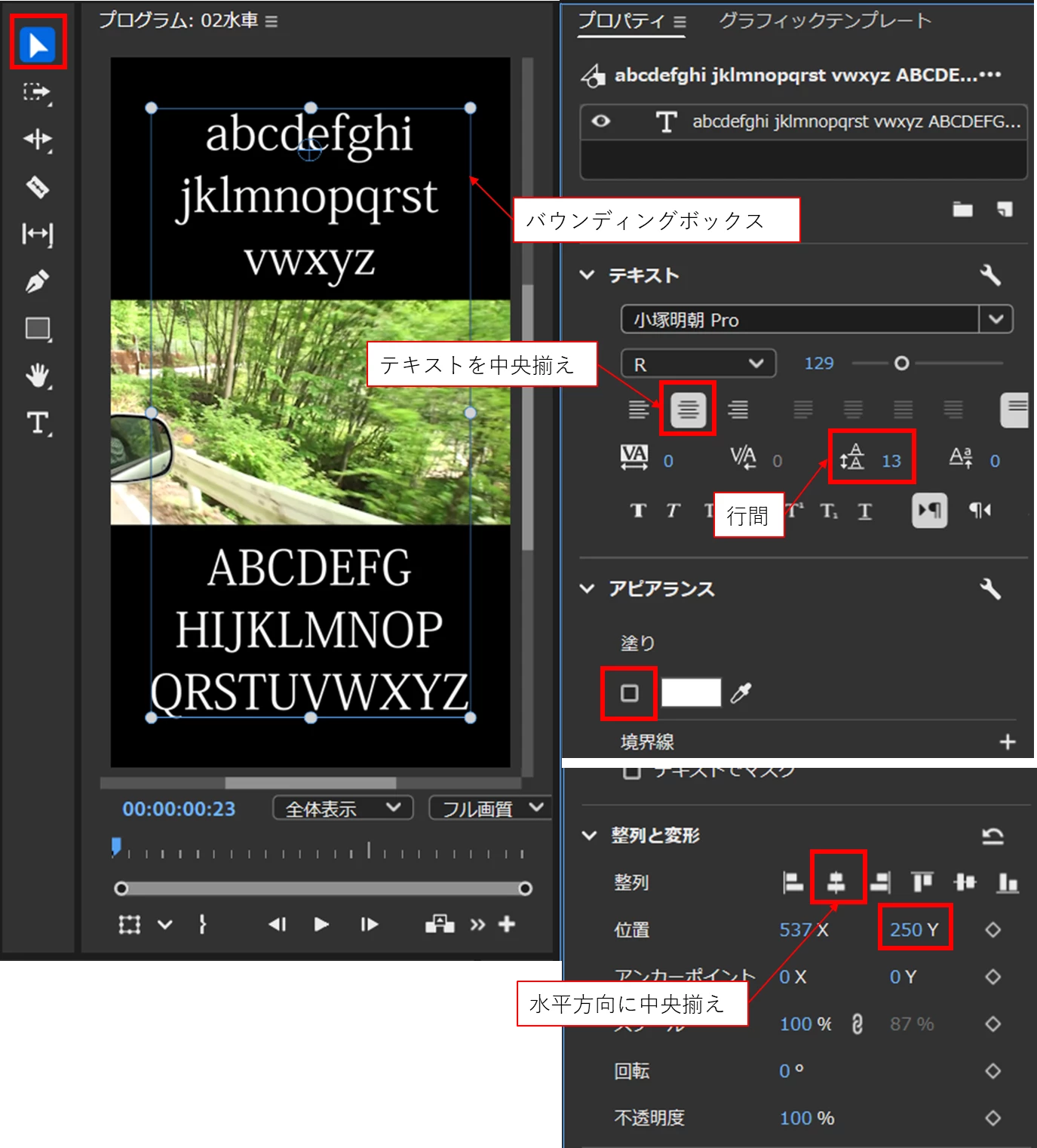 ②「横書き文字ツール」から「選択ツール」に持ち替えると「バウンディングボックス」が表示されます。「テキスト」項の「行間」で行間を調整し、「テキストを中央揃え」続いて「整列と変形」項の「水平方向に中央揃え」アイコンをクリックしてテロップ体裁を整えます。「位置」の「Y」数値で上下方向を調整します。