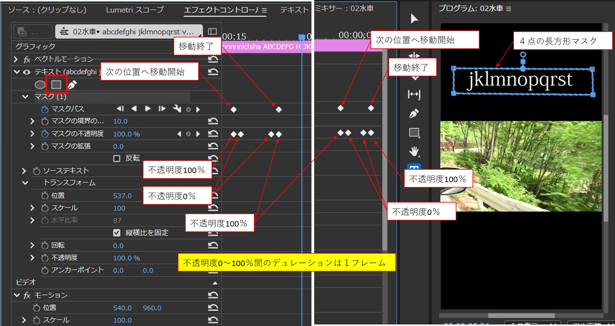次に「マスクパス」と「マスクの不透明度」に下図のようにキーフレームを打ちます。