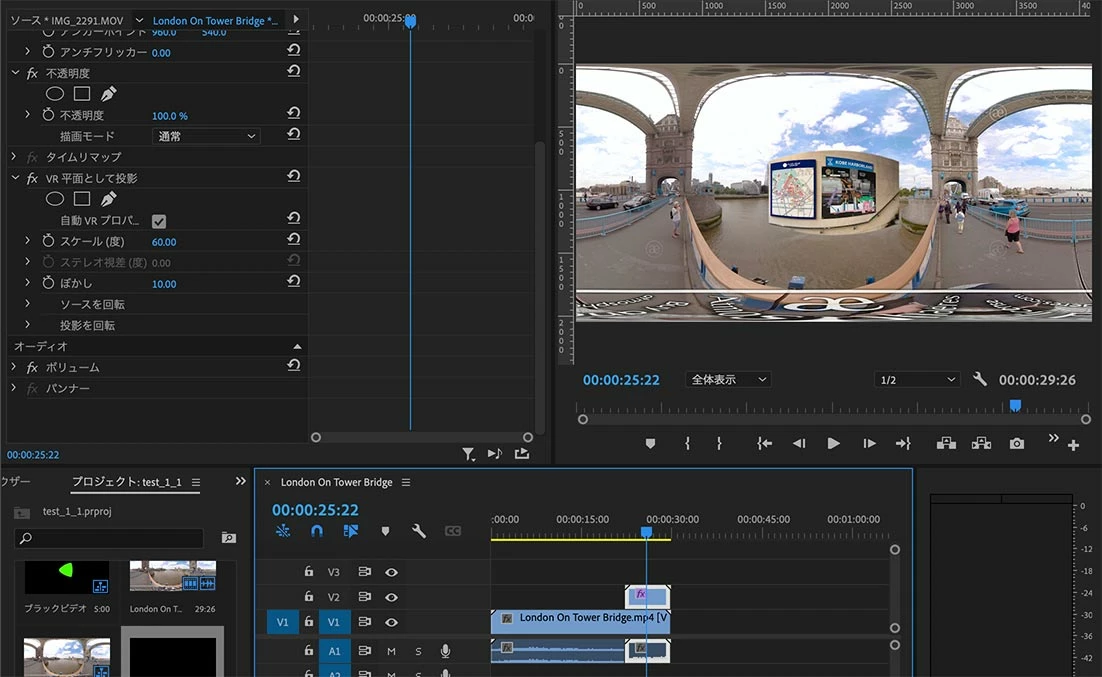 同じシーケンス上で、普通の動画のなかに、360度の映像を差し込むには