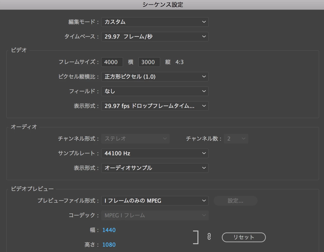 普通に素材を読み込んでシーケンスに並べると、シーケンスのフレームサイズが「4000横 3000縦」の4:3になります。