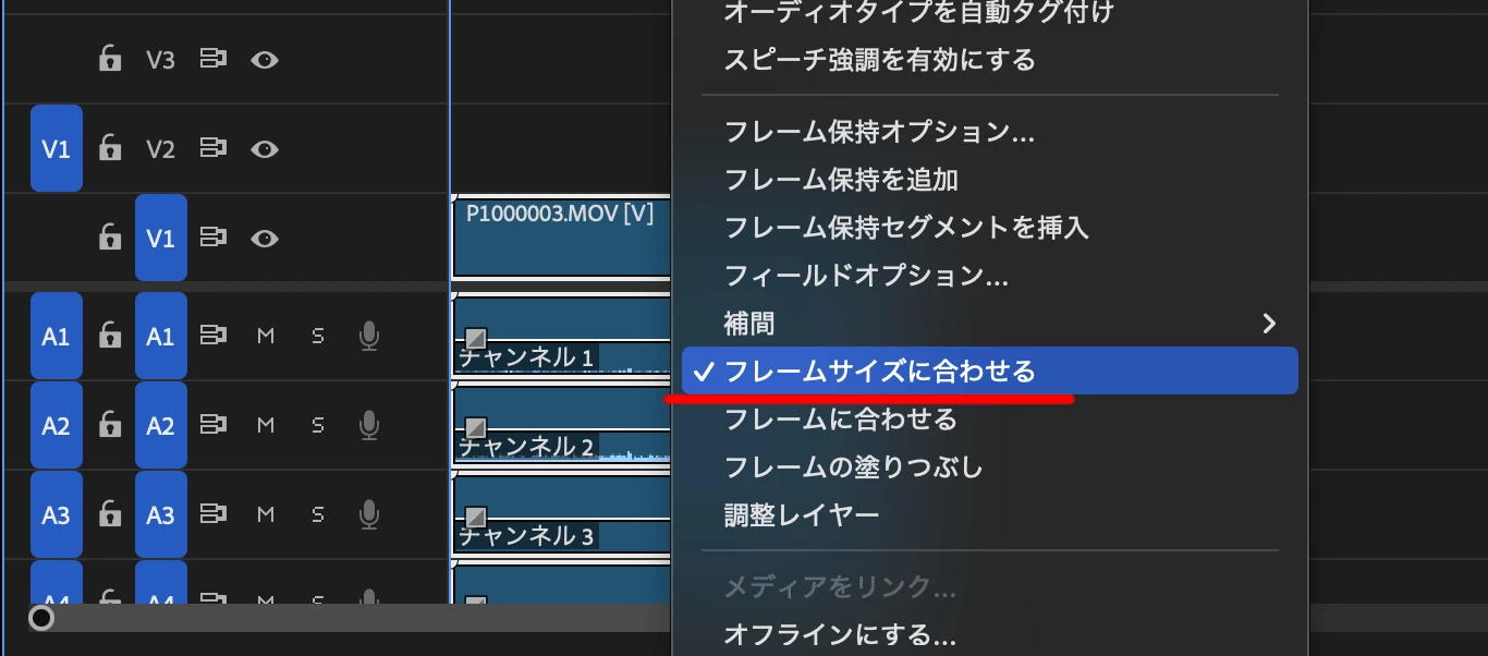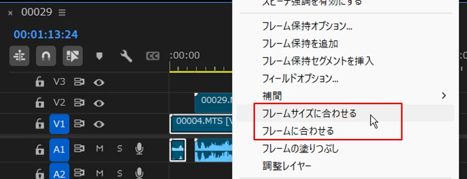 映像の表示方法は、「フレームサイズに合わせる」と「フレームに合わせる」の2種類あります。これはクリップを右クリックして開いたコンテキストメニューから設定できます。v24.6.5以前は用語少し異なります。