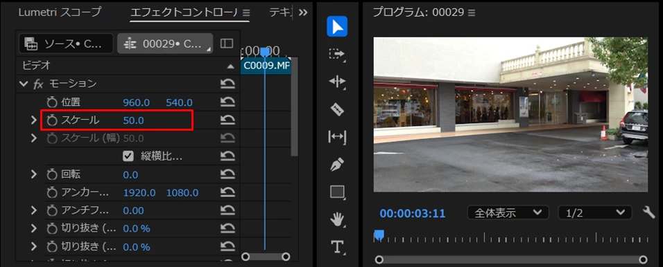 プログラムモニターサイズが100(等倍)にもかかわらず、「エフェクトコントロール」パネルの「スケール」が「50」になっていることを指していると思いますが、これは上記の「フレームに合わせる」項に記載の通りです。