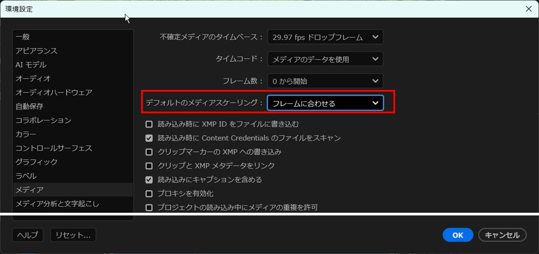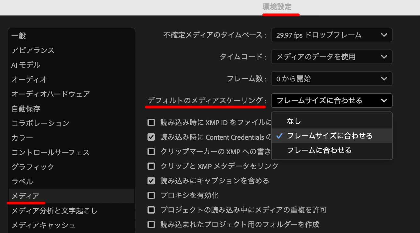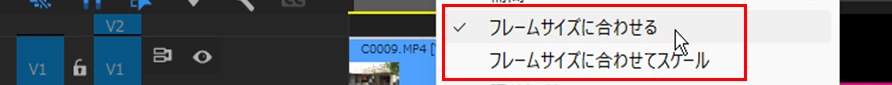 元の映像の解像度を現在のシーケンスの解像度にリサイズし、サイズはシーケンスのフレームに合わせます。