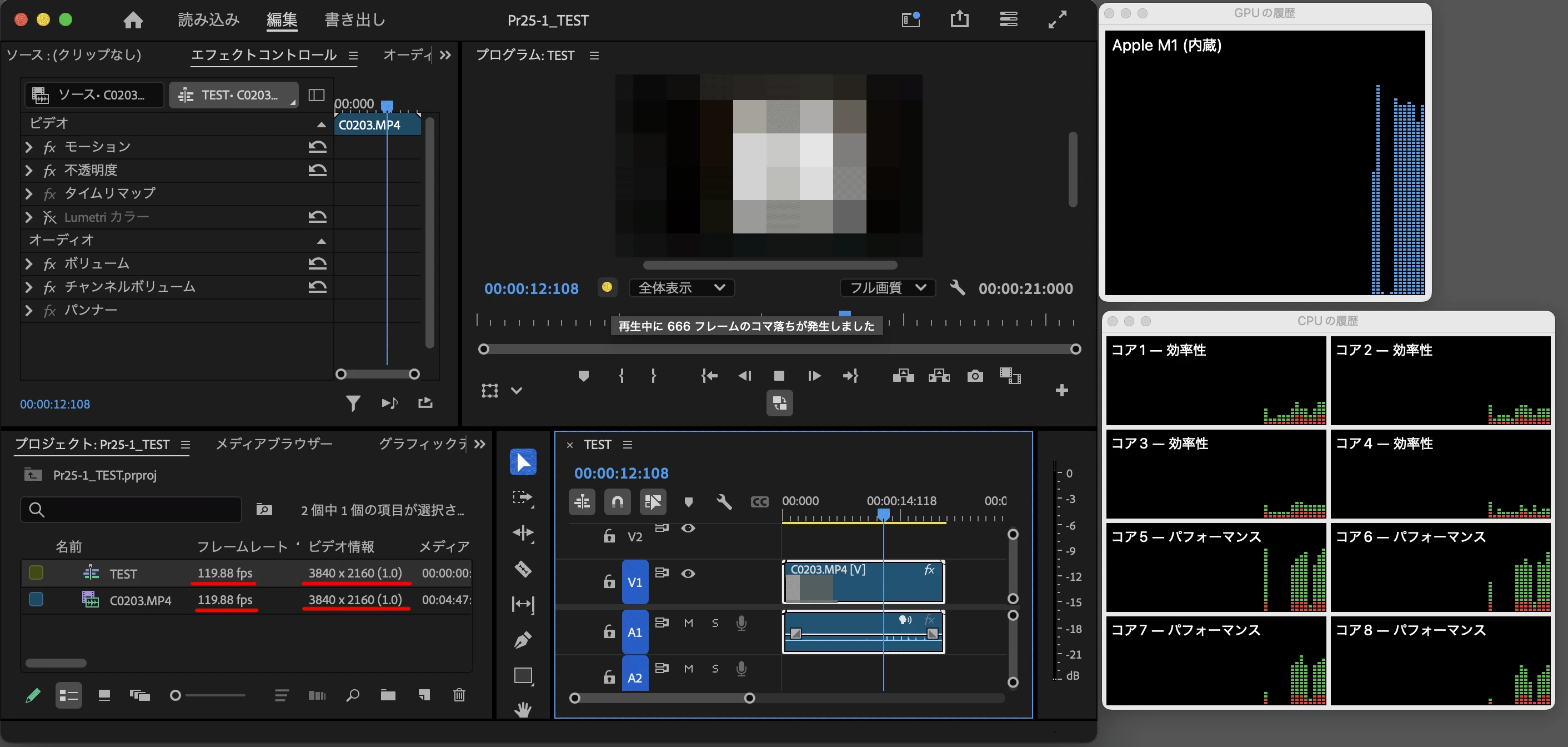 手元の少し古いM1のMac(MacBook Pro 13-inch, M1, 2020, RAM 16GB)にて、XAVC S 4K 10bit 4:2:2 280Mbpsのファイルで試してみましたら、コマ落ちはしているものの、見た目ではかなりスムーズに再生できました。