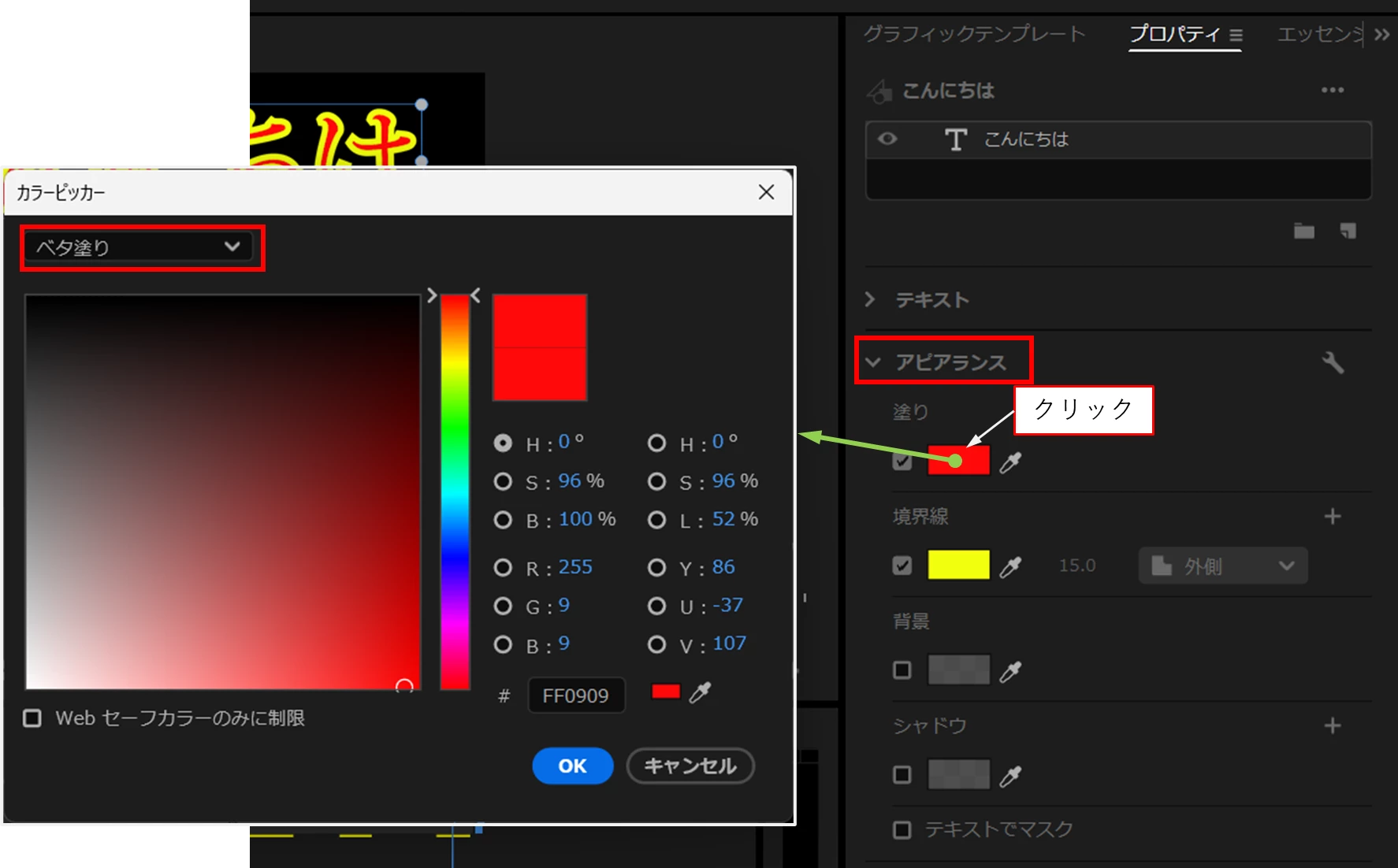 その場合は、「アピアランス」項の「カラー」の部分をクリックすると「カラーピッカー」が表示されます。