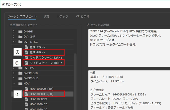adobe premiere 新規プロジェクト作成時の選択肢をどれにすべきか全くわかりません。