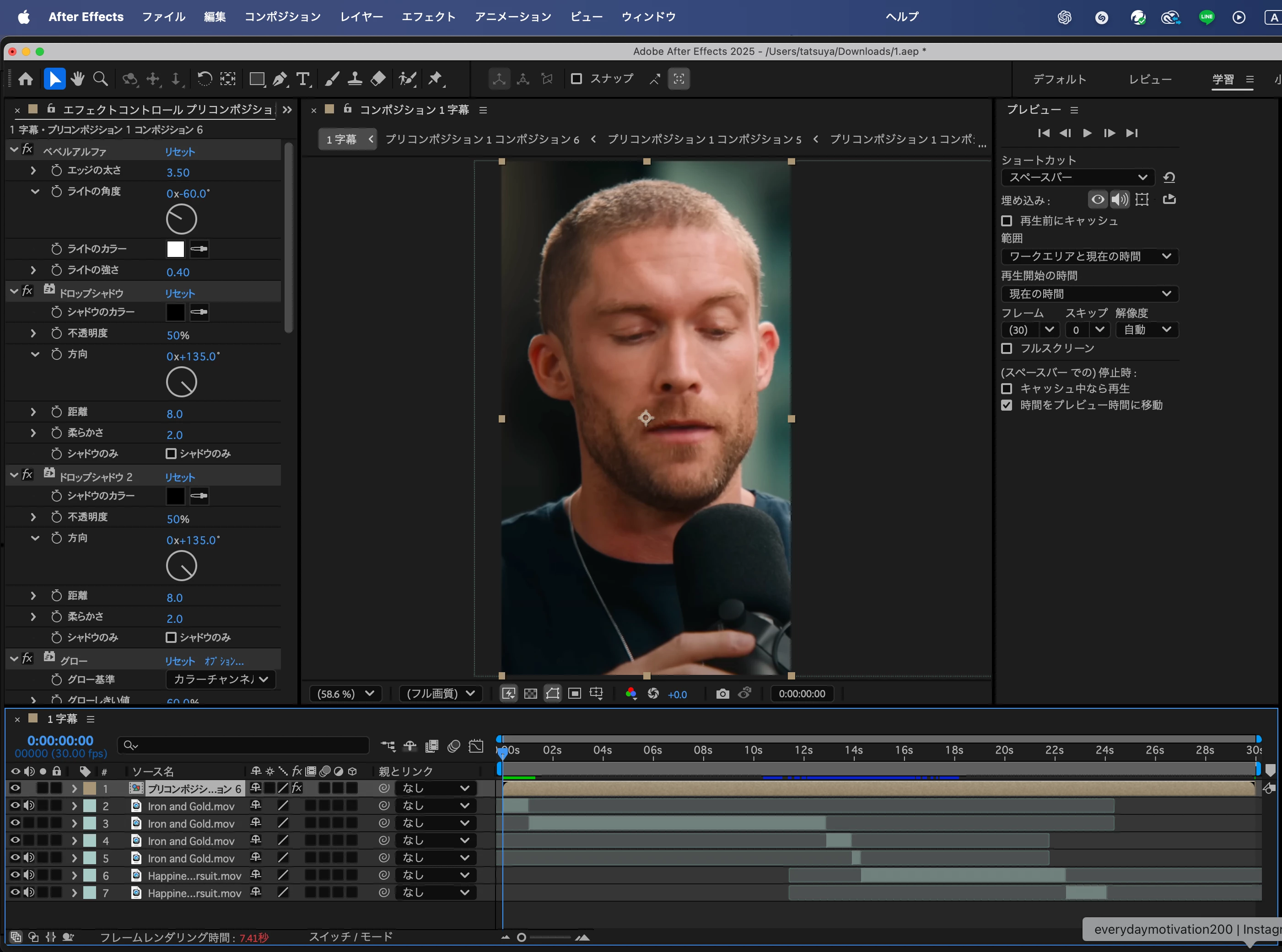 次にAeでは、一括で同じエフェクトを適応させやすいように、すべての字幕部分を選択してプリコンポーズしました。その後はエフェクト&プリセットから様々なエフェクトを選んで適用してはプリコンポーズしてということを繰り返しました。
