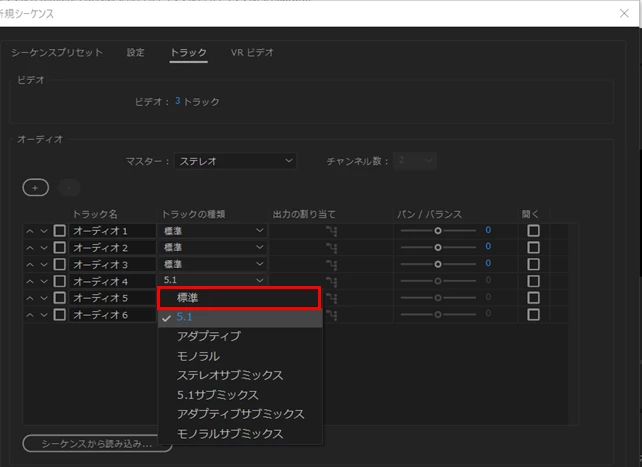 シーケンス設定時に、「新規シーケンス」ウィンドウで、「トラック」タブをクリックするとオーディオトラックの仕様を設定することが出来ます。