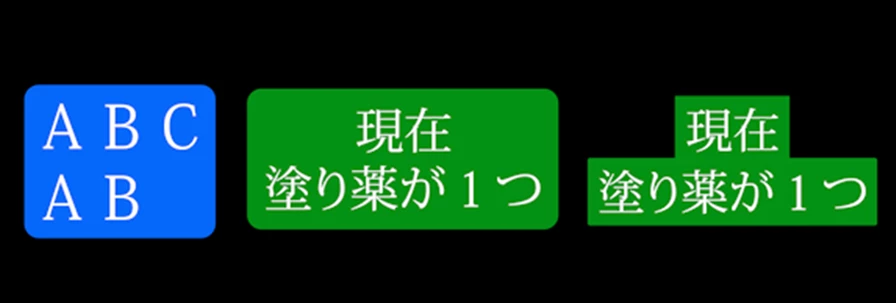 Premiere Proでは文字列全体に背景を付けることができます(左図、中図)。右図のようにするには「現在」と「塗り薬が1つ」に文字列を分ける必要があります。