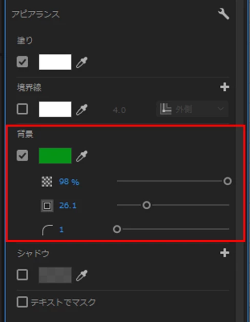 また、背景には、アピアランス項で不透明度、サイズ、角丸を設定出来ますす。