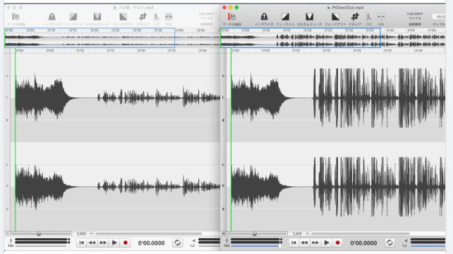左側がMeでエンコード後の音声波形、右側がPr直でエンコード後の音声波形です。