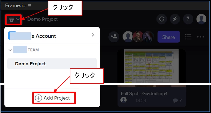 ②Frame.ioのサイトを開き共有したい動画のファイルの作成と動画をアップロードする