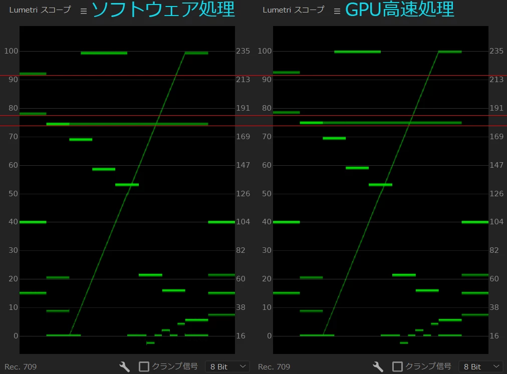 それぞれの設定にて出力した映像をPremiereに読み込み、Lumetriスコープにて比較した画像を添付致します。