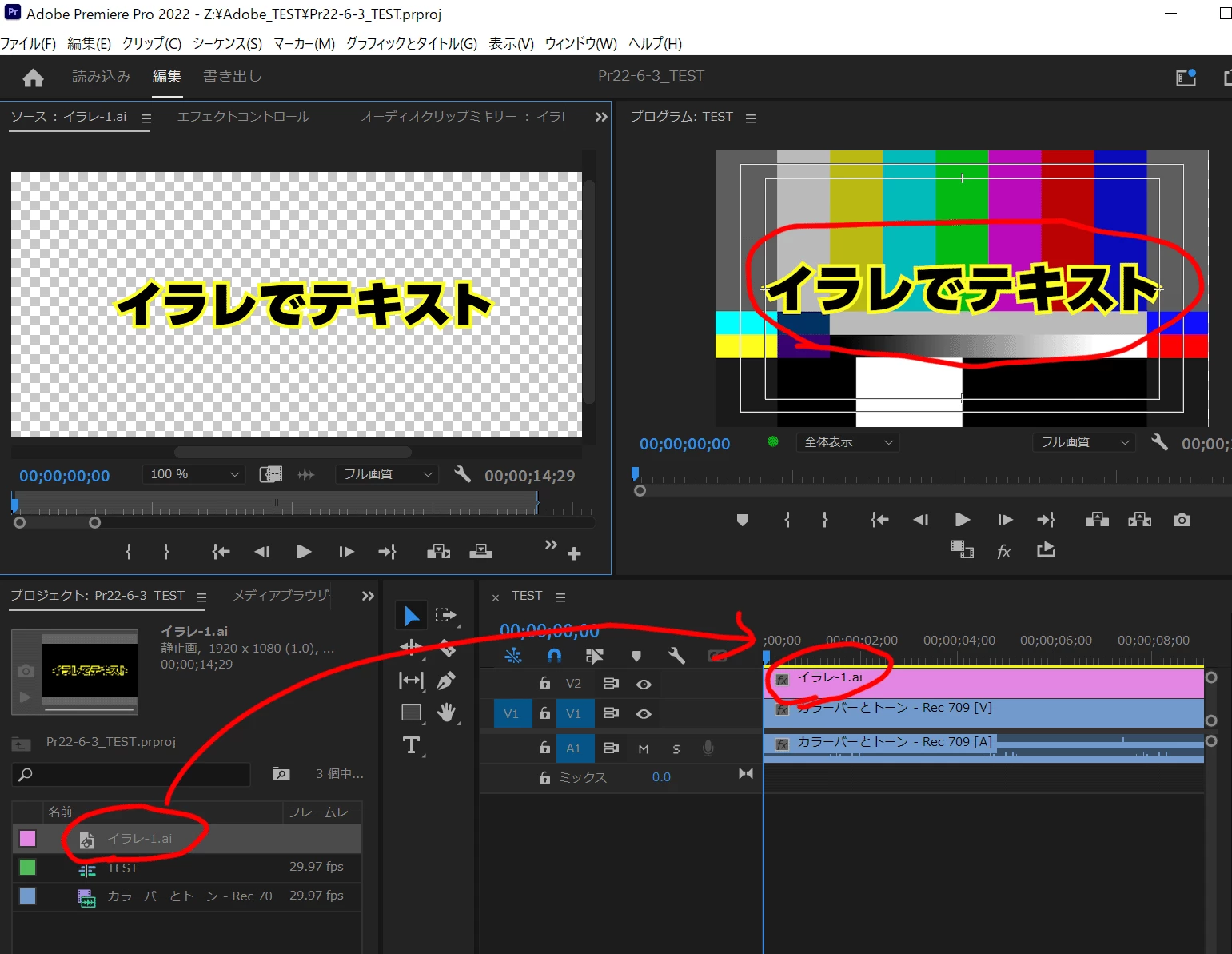 aiファイルを読み込んだあとですが、Pr上ではテキストの編集が行えないので、