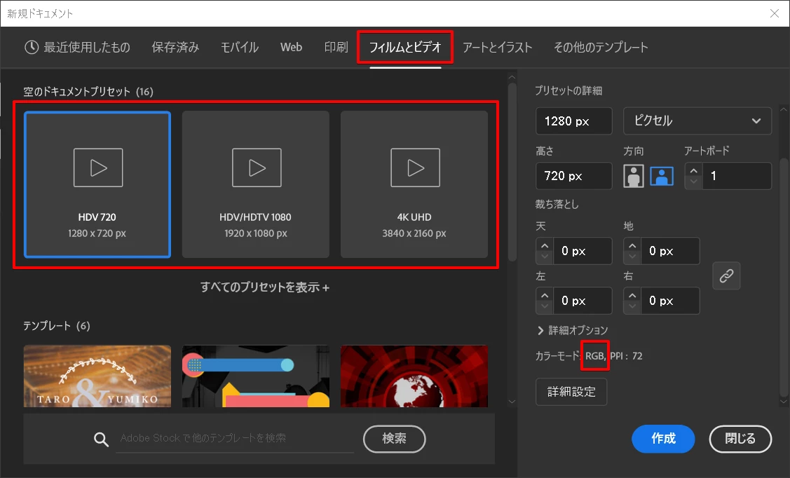 Illustratorでは最初のドキュメント設定で「フィルムとビデオ」を選ぶことで映像のサイズに適して、且つ背景が透明の状態のアートボードが作成されますので便利です。
