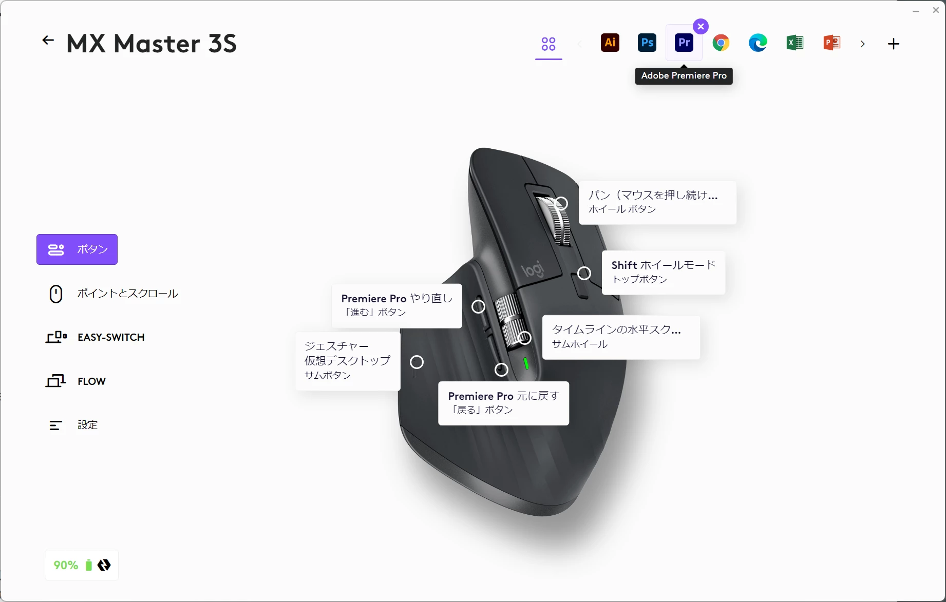 Logi Options+を起動して、認識されているマウスを選んだ後、[ボタン]の画面で↓のようにPremiere Proのキー割り当てがあれば使えるのではと思うのですが。。(この画面は、デフォルトのキー配置)