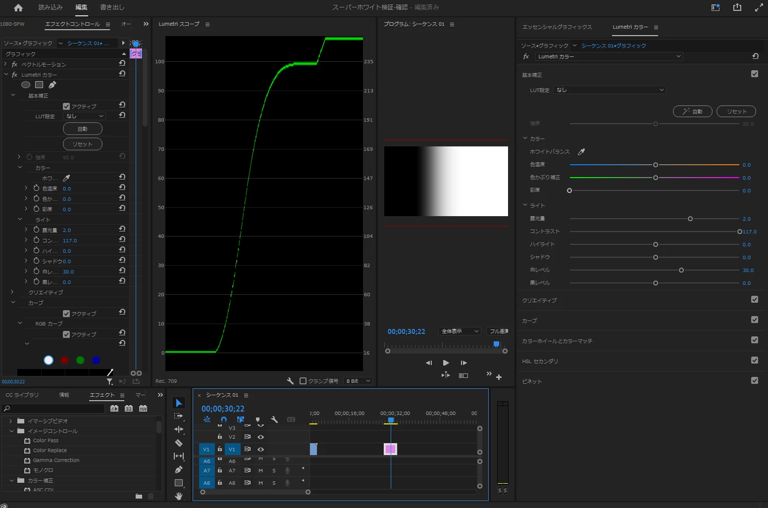 これでは「カラーコレクション」としては失敗になってしまうので、他にカーブを併用するなどして整える必要が出てくるのですが(もっとも、カーブだけでも明るさ調整できますが)、そういった面倒なことを考えずに調整できるのが「Lumetriカラー」ということかと思います(スーパーホワイトが絡むと注意が必要なのは、ご質問の通りなのですが……)。