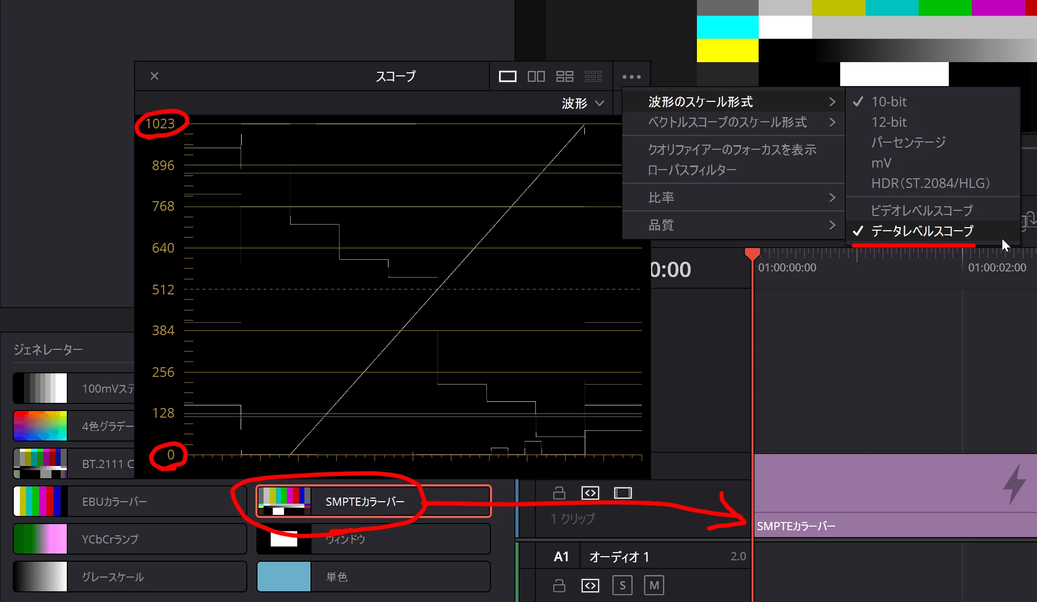 別の方向からアプローチしていただいた方が問題の本質が見えやすいかもしれないと思いましたので、Resolveのジェネレーターで出したカラーバーの波形の画像をのせてみます。
