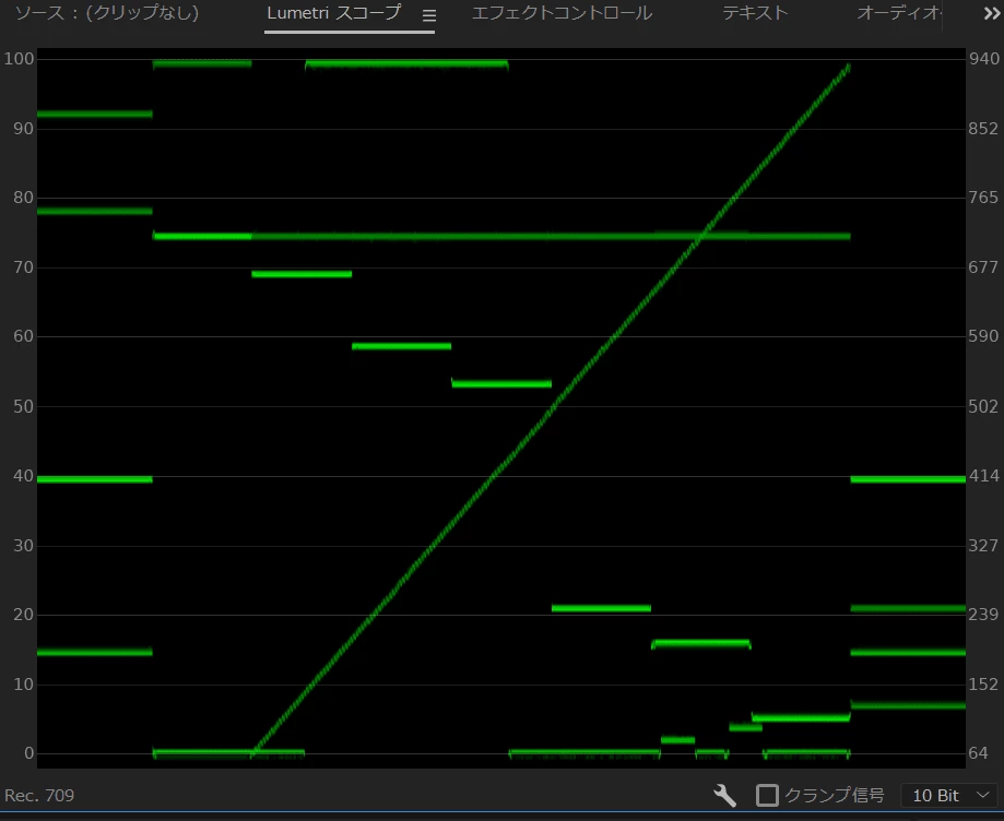 >Lumetriスコープ右側の64~940の値に合わず、100~860辺りの値を示しています。