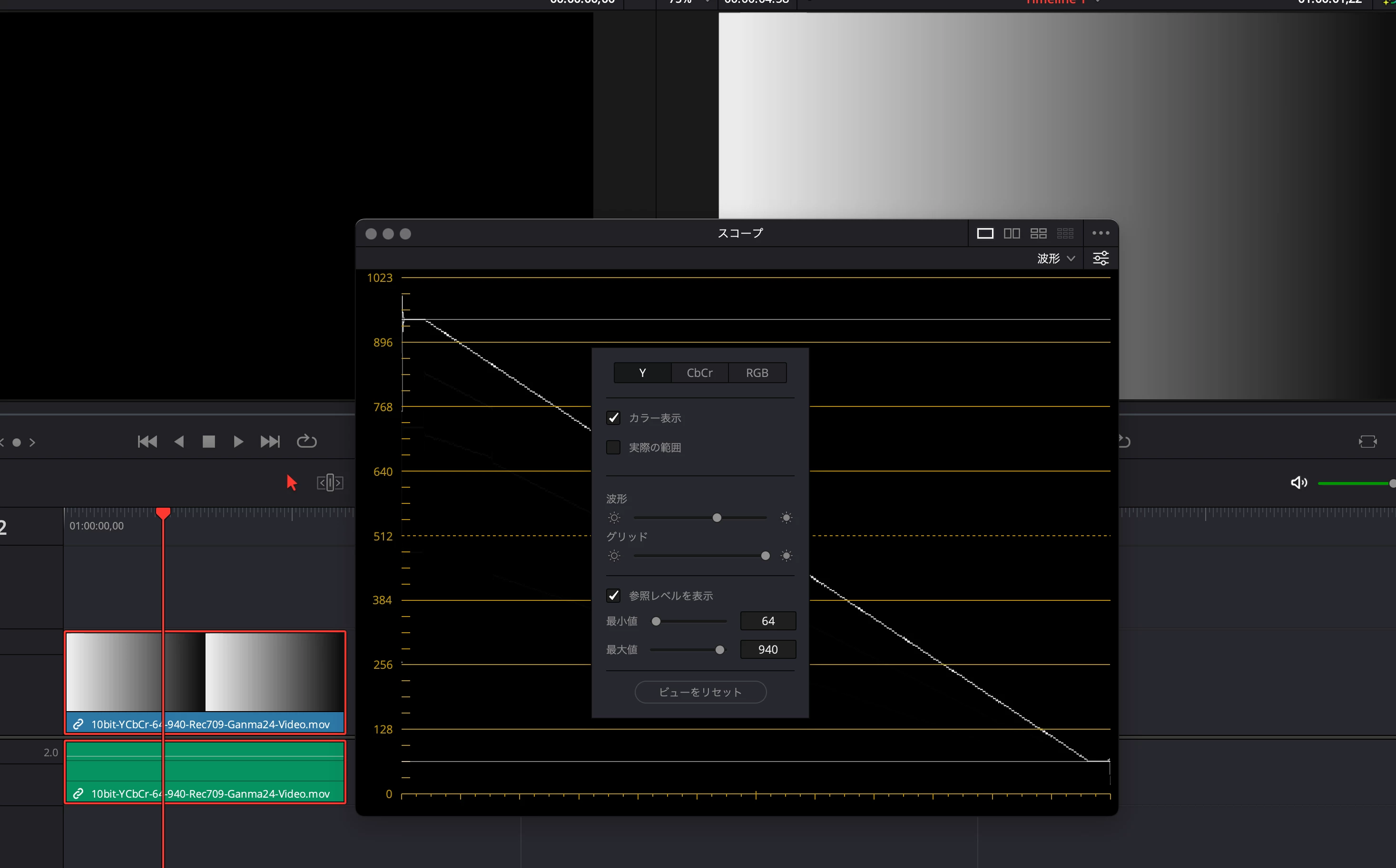通常のビデオ信号を10bitコード値で表現すると、黒は64、100%白は940ですが、添付した画像のようにResolveでは黒が0、100%白が1023になっています。