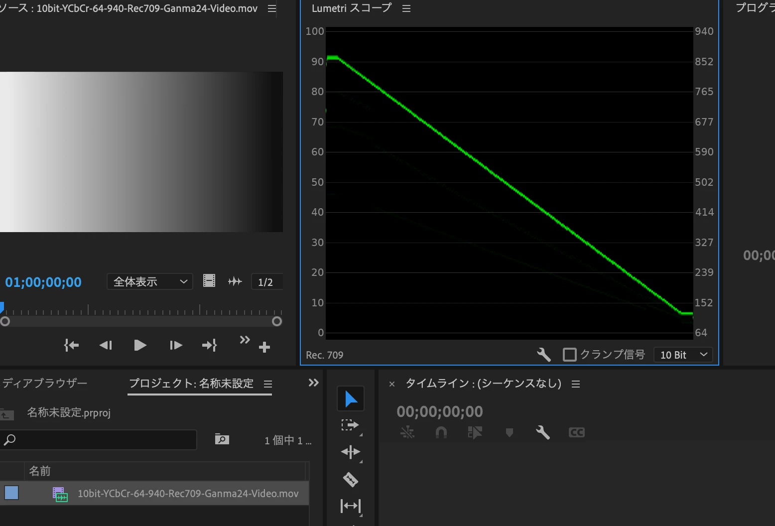これをビデオレンジでProRes422に書き出してPremiere Proに読み込むと、Premiere Proのスコープでは黒が64、100%白が940になります。