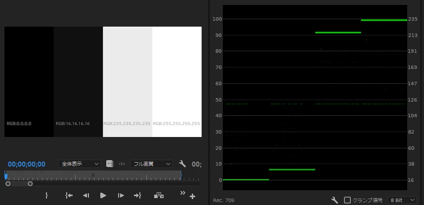 Premiere Proは素材に合わせて良くも悪くも読み込みのレンジが決まりますが、基本的にはそのファイルの仕様に合わせた読み込み方になります。