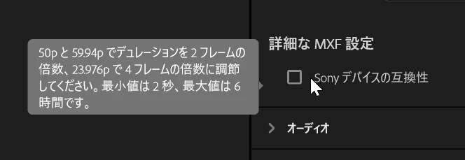 MXF OP1a形式で書き出す際の「Sonyデバイスの互換性」チェックについて
