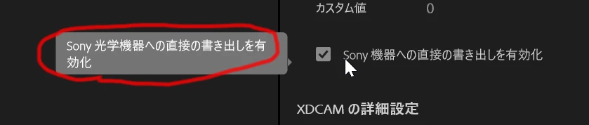 なぜそのような仕様になっているのかまではわかりませんが、「Sony機器への直接の書き出しを有効化」はSONY製光学ドライブ(PDW-Uシリーズ)に挿入したPDへの直接書き出し時にのみ使用する機能(添付画像もご参照ください)なので、光学ドライブではないSxS含を含め、PD直接書き出し以外の状況ではチェックを入れずお使いいただくということになるかと思います。