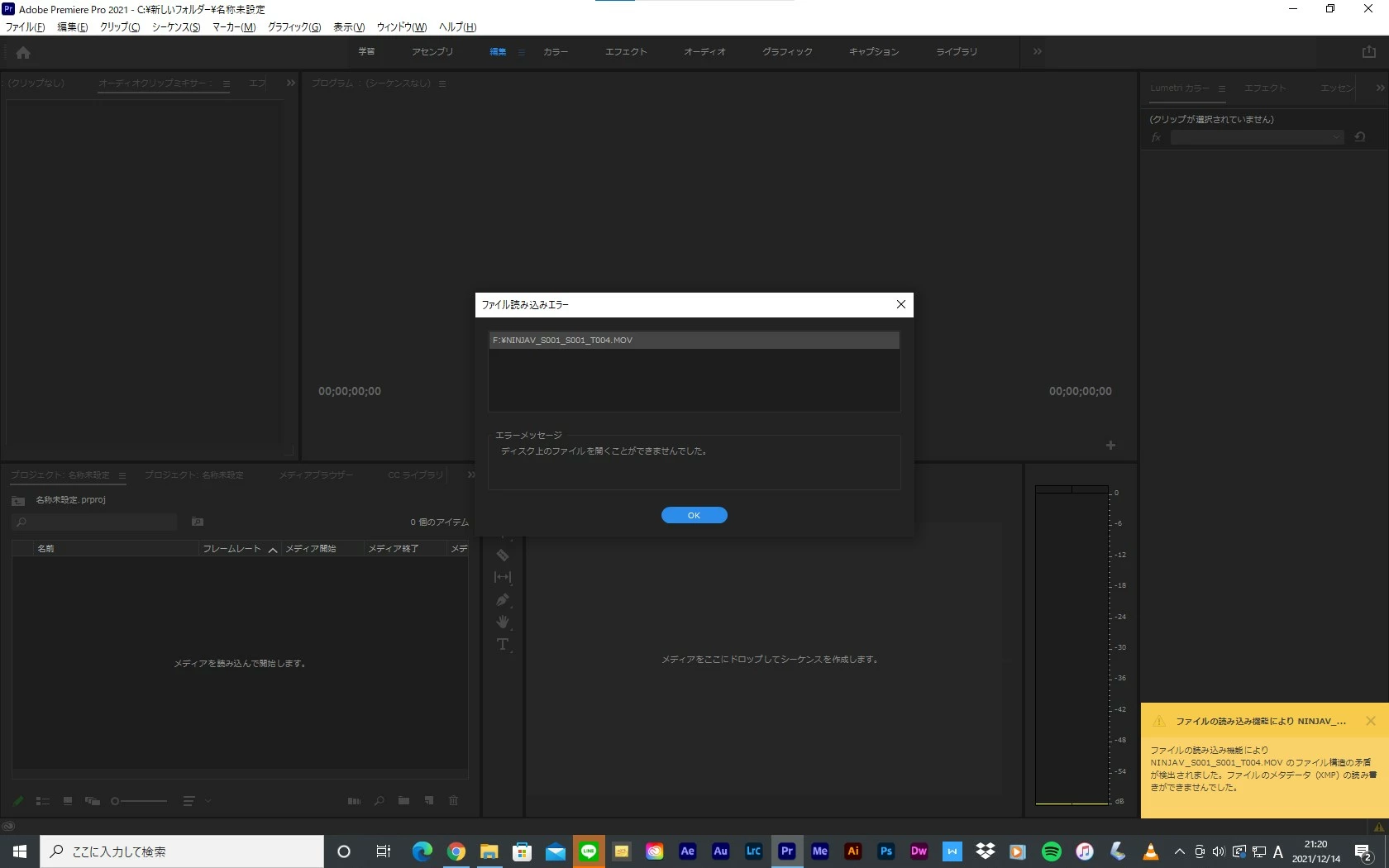 Windows 10でNINJA Vで収録したMOV.データをPremiere Proに読み込ませようとしても、「ファイルの読み込み機能により NINJA V……のファイル構造の矛盾が検出されました。ファイルのメタデータ(XMP)の読み書きができませんでした」というエラー表示が出て、読み込んでくれません。