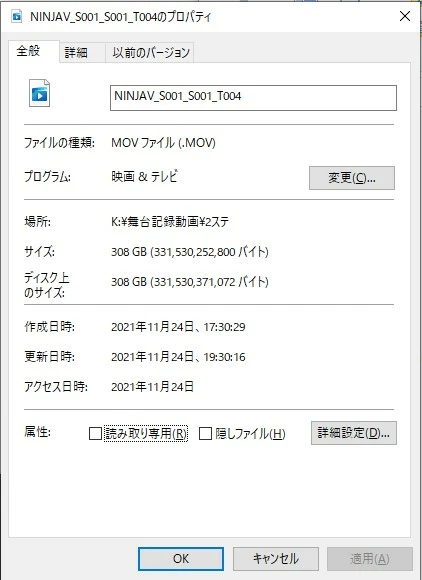 プロパティの「全般」欄にはデータサイズや作成日時が表示されているものの、「詳細」欄のビデオのところには収録情報が記載されておらず、これはデータが破損しているのでしょうか? データサイズが308GBあるため空き容量が足りないだけなのでしょうか。どう確認すればいいのかわかりません。どなたかご教授くださいませ。