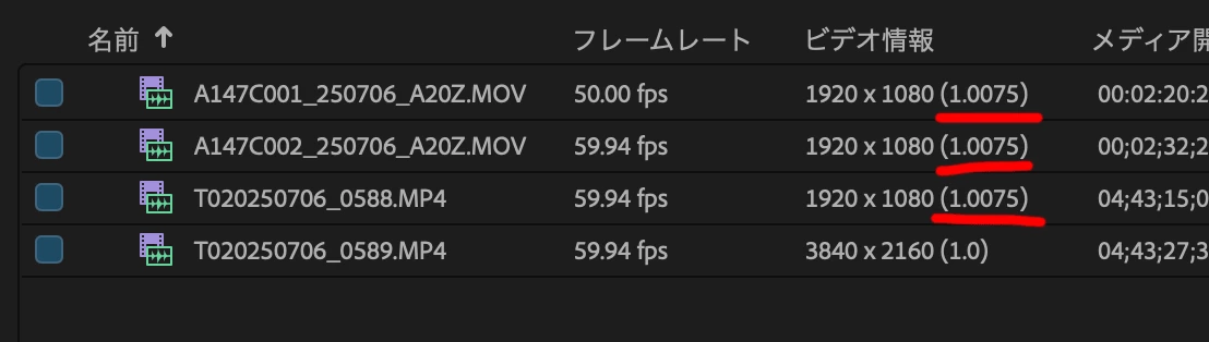 ビデオ情報のアスペクトが1920x1080(1.0075)でインポートされます。