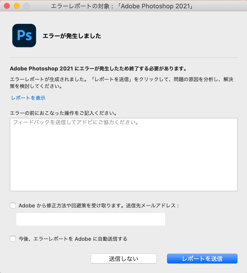 puchicoParticipantForum|Forum|4 years agoApril 30, 2021Questionphotoshop2021が起動せずエラーになります。Forum|Forum|4 years agoApril 30, 20211 reply167 viewsphotoshop2021が起動せずエラーになります。対処方法を教えてくださいませ。経緯2021最新版が起動しなくなった(アイコンがジャンプした後何も起こらない)↓アンインストールし、入れ直したが同じ↓バージョンを下げてインストールしたが同じ↓最新版をインストールしたところ起動しようとすると添付のエラーが出るようになった全く対処方法がわからず、どうぞよろしくお願いいたします。エラーまたは問題