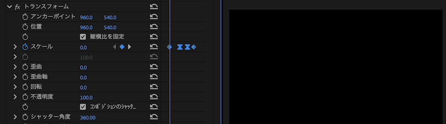 自力で似たようなエフェクトを作成しようとも考えましたが、ベクトルモーションで作成しようとするとモーションブラーをつけることができず、トランスフォームで作成しようとするとPop Motion Impactsと同じようにはみ出した部分が消えてしまい、行き詰ってしまいました。