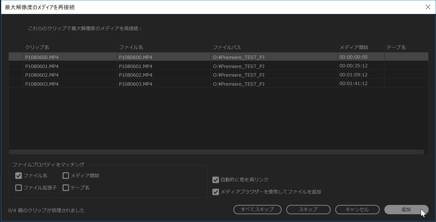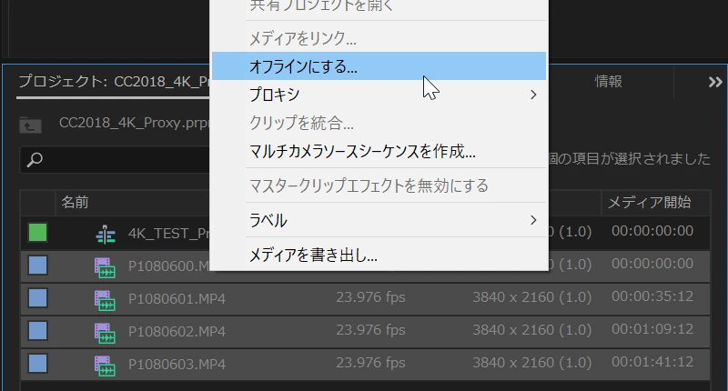 インジェスト機能を仕様し4K素材からHDのプロキシを作成しオフラインのワークフローを設定しました。