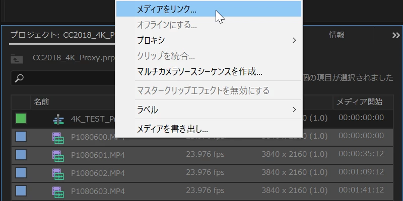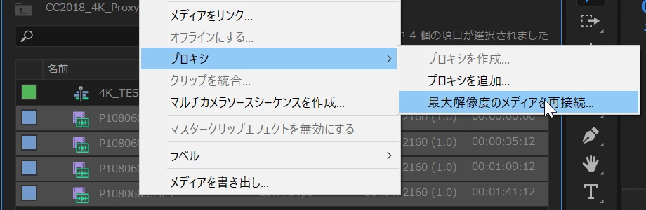 プロキシの切り替えをし、常にオリジナル(4K)とプロキシ(HD)を切り替えれる状態です。