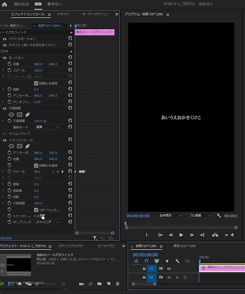 画像中の数値から、「1920×1080」の横長シーケンスで作成した「ソースグラフィック」を、「720×1280」の縦長シーケンスで使用している状況かと思います。