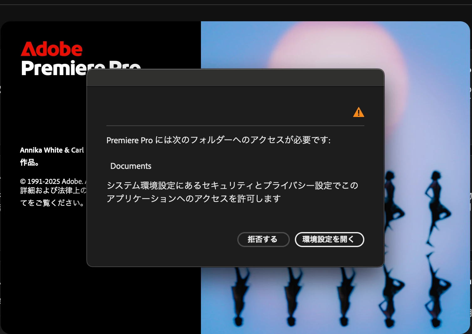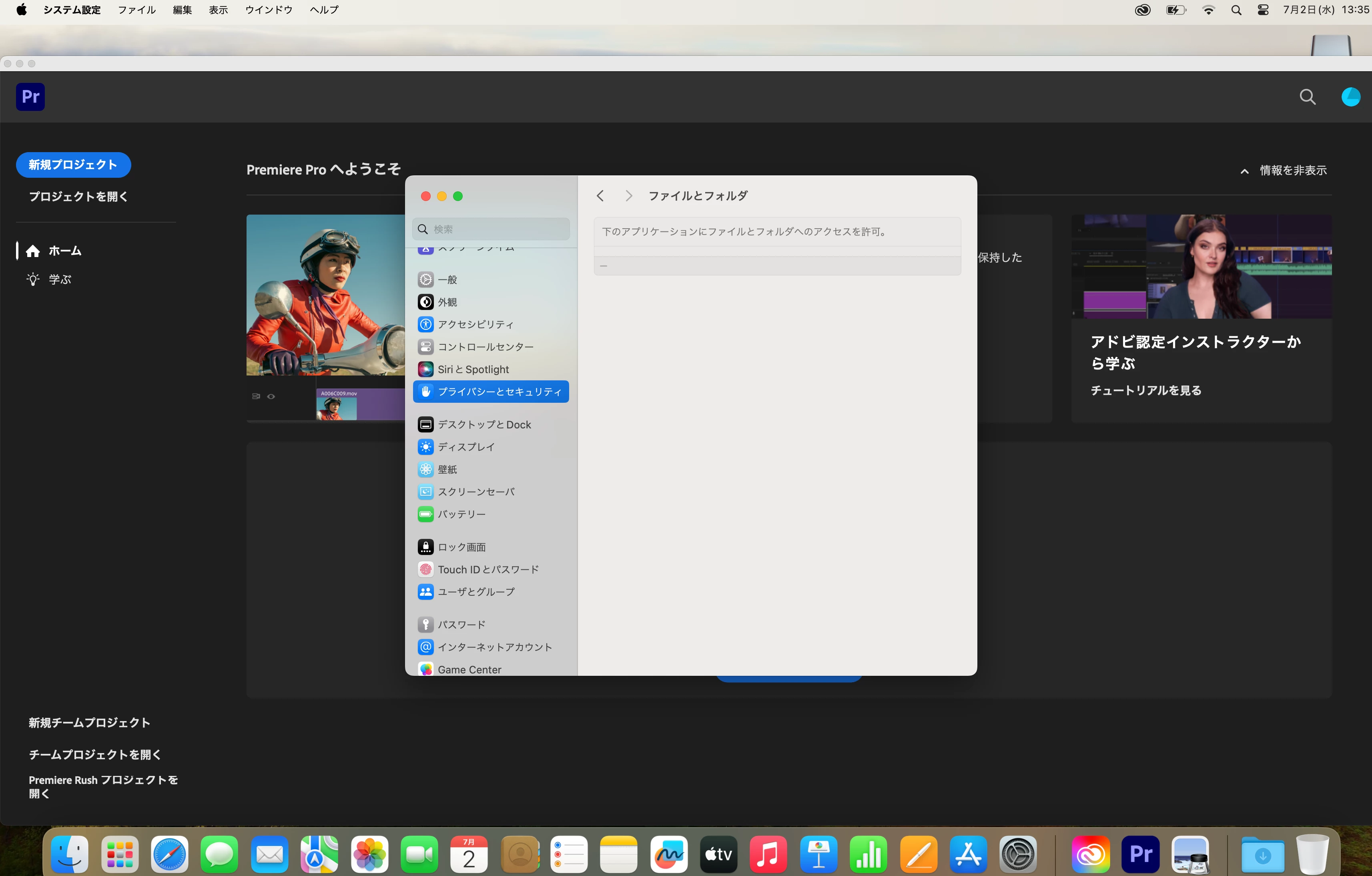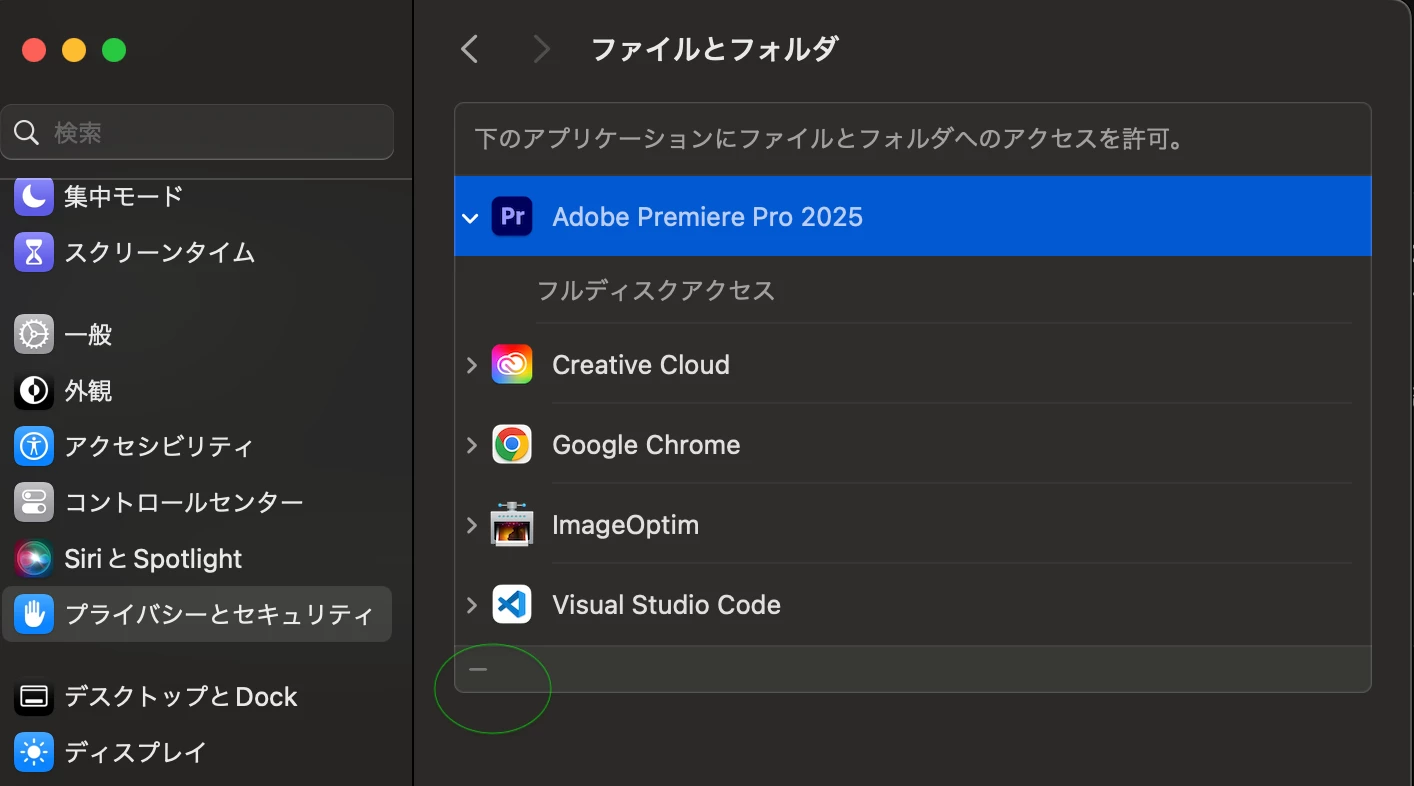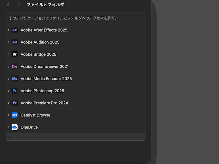 ・Documentsへのアクセスを許可するよう促されるので、ファイルとフォルダ項目でプレミアプロをフルディスクアクセス許可済み。