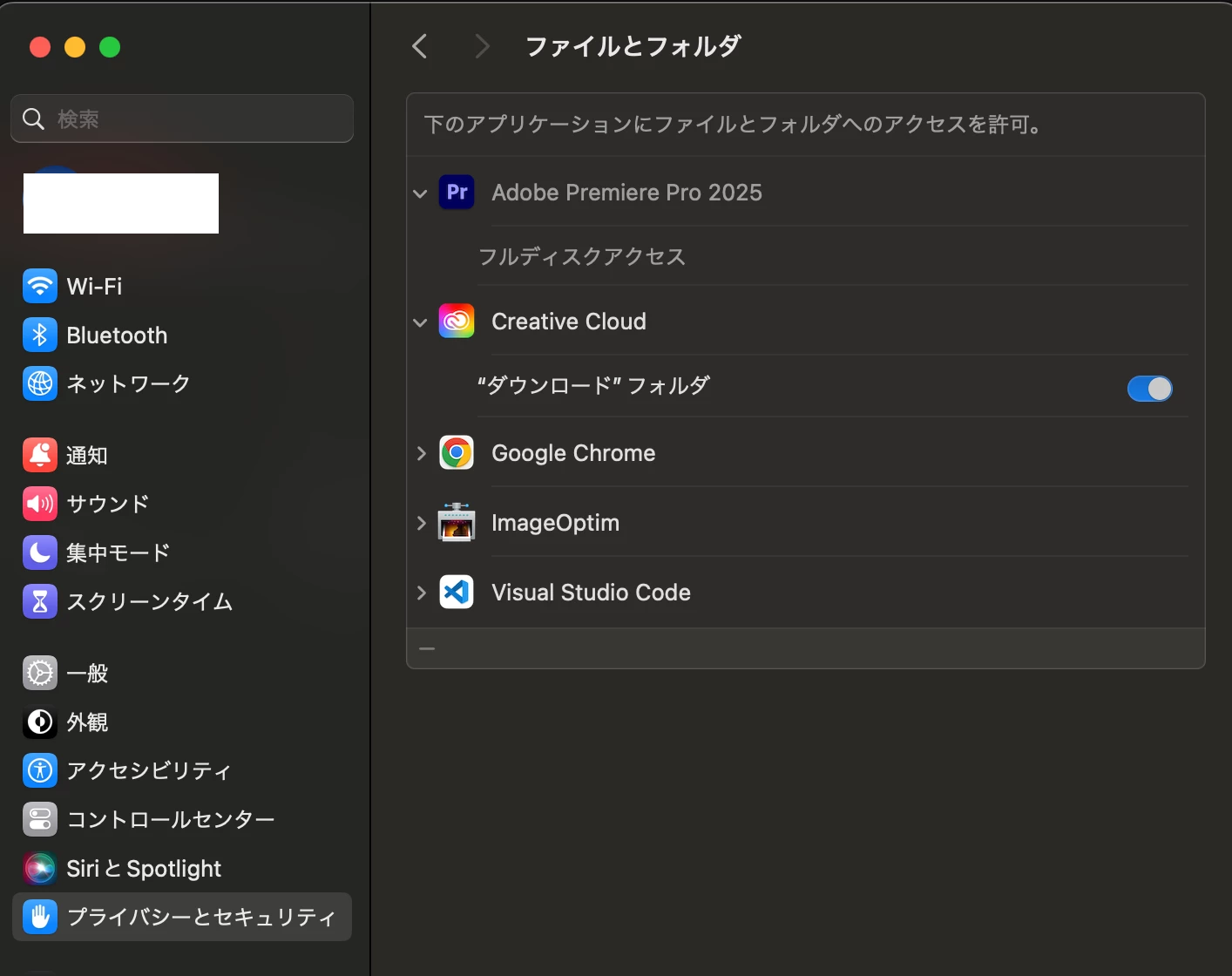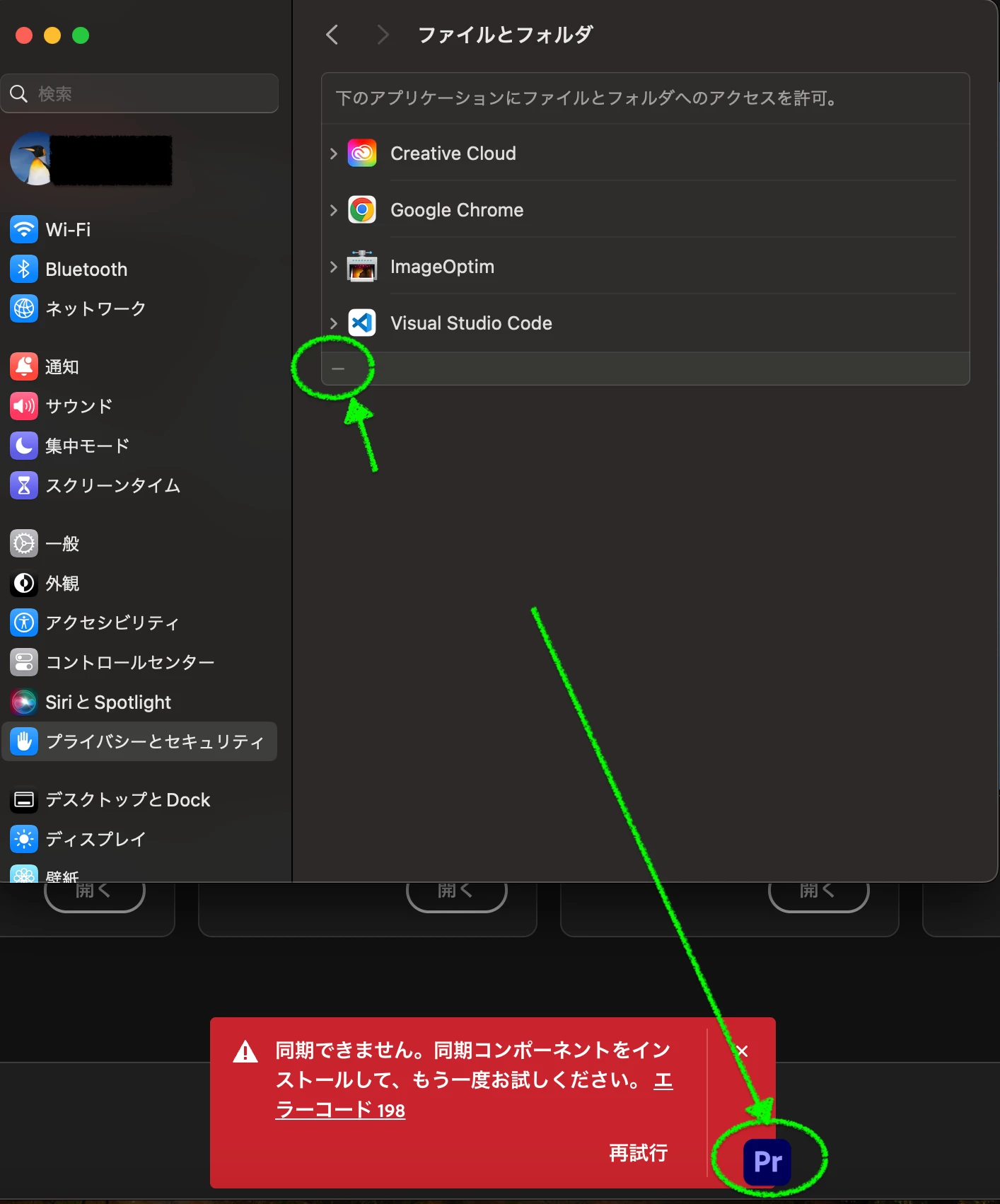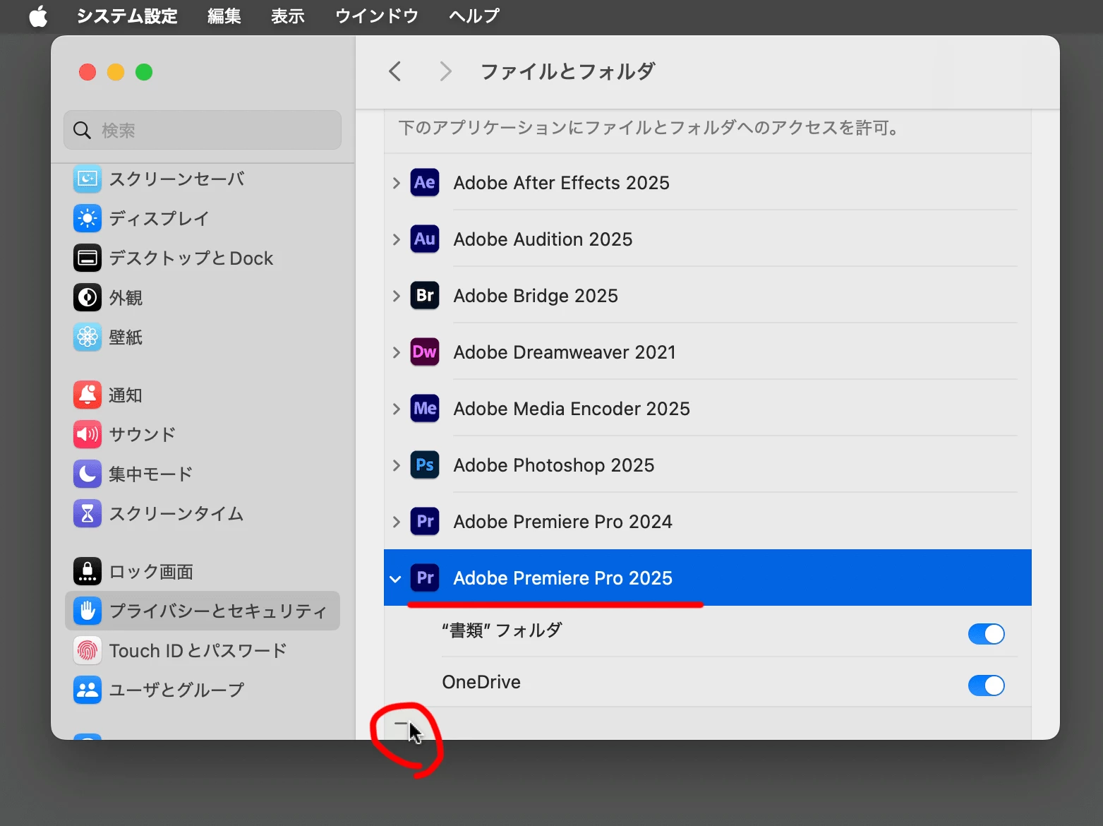 ・Documentsへのアクセスを許可するよう促されるので、ファイルとフォルダ項目でプレミアプロをフルディスクアクセス許可済み。