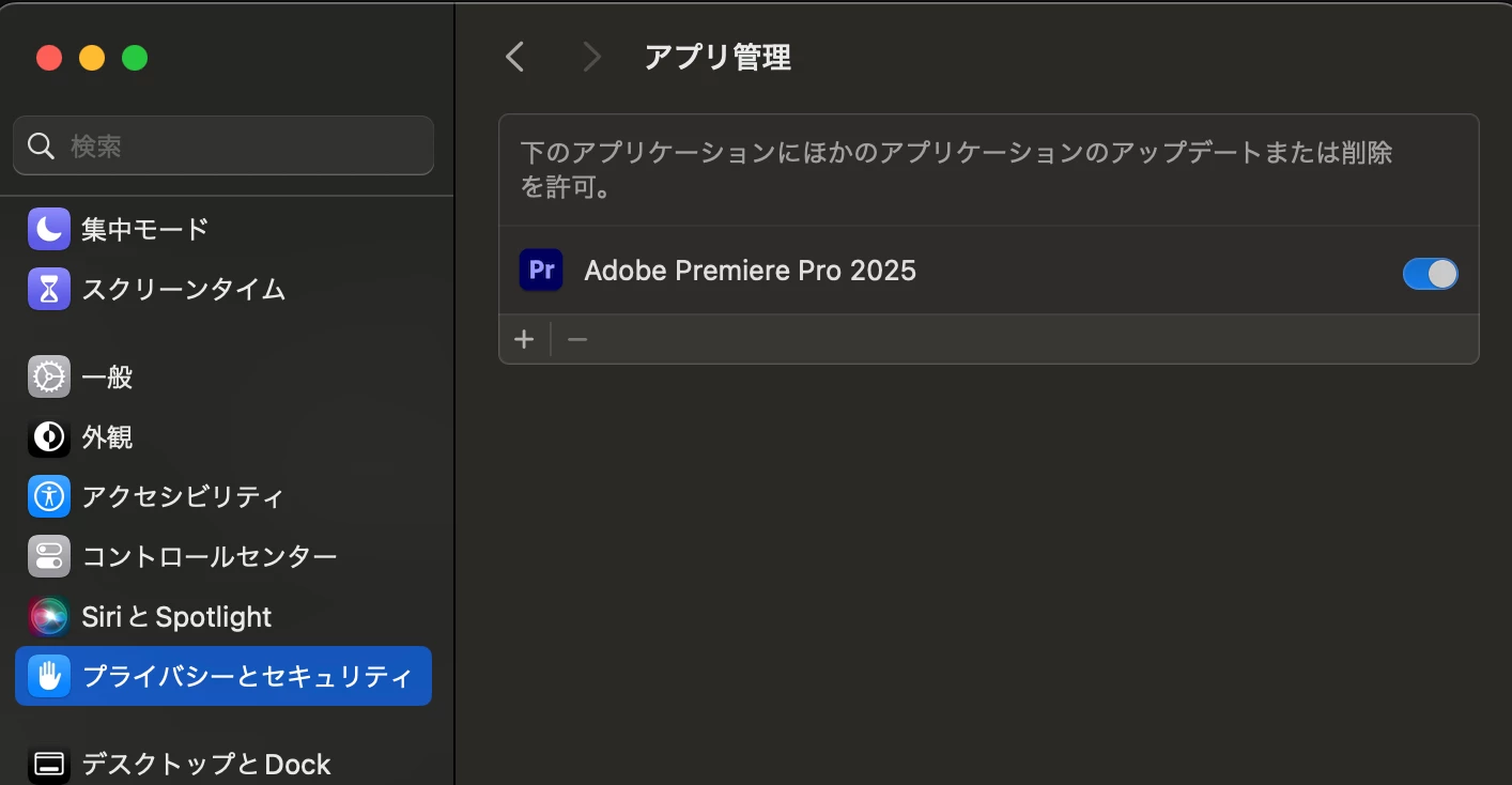 ・プライバシーとセキュリティ項目でプレミアプロに許可済み。