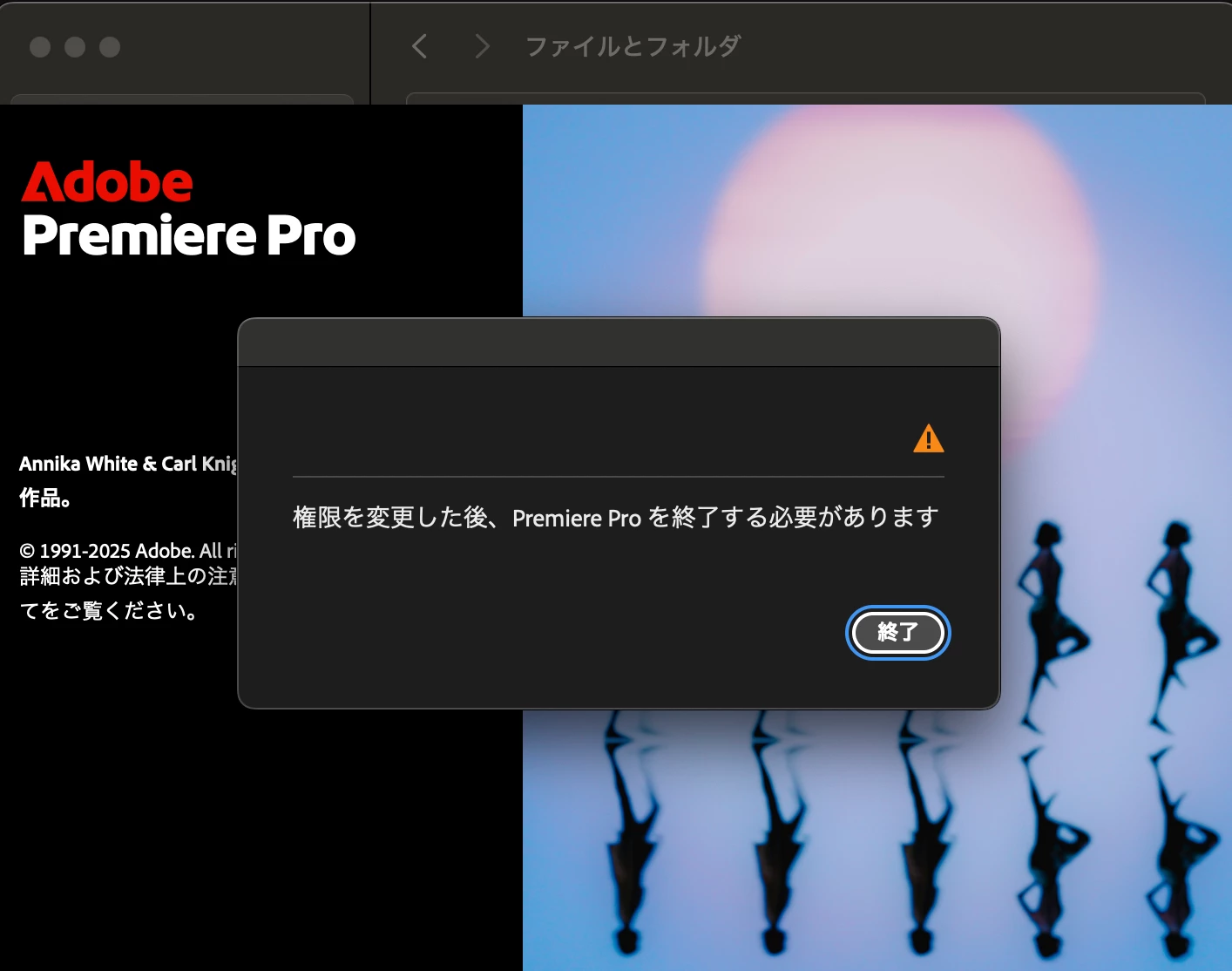 ・権限を変更した後、プレミアプロを一旦終了。
