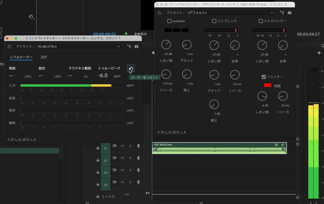 TP値は参考のため表示させていますが、オーディオレベルメーター(おそらくサンプルピーク値)も-6dBFSを少し超えています。