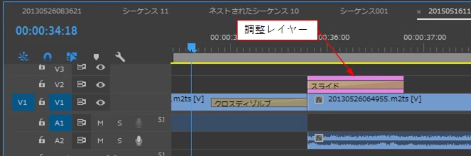 ①調整レイヤーを作成し、それにもう1個のトランジションをかければ、2個のトランジションをかけた場合と同様になります。