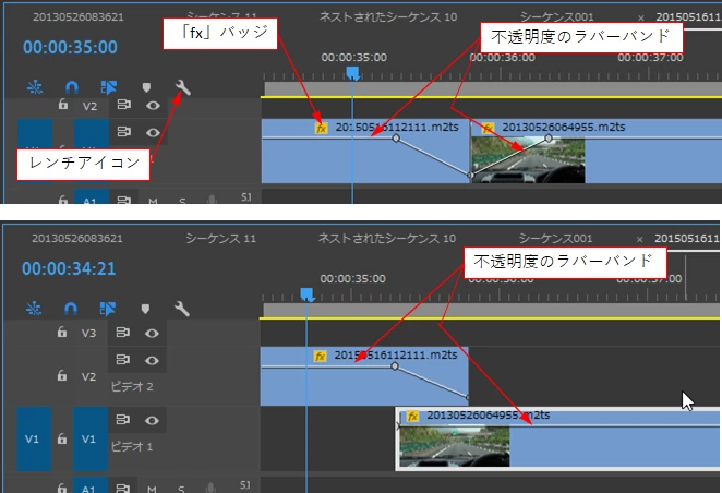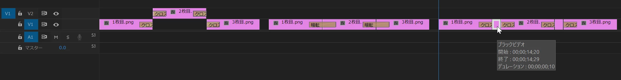 下上図は前側のクリップの映像が完全にフェードアウトした後、後ろ側のクリップの映像がフェードインします。ラバーバンドの折れ線からイメージできると思います。