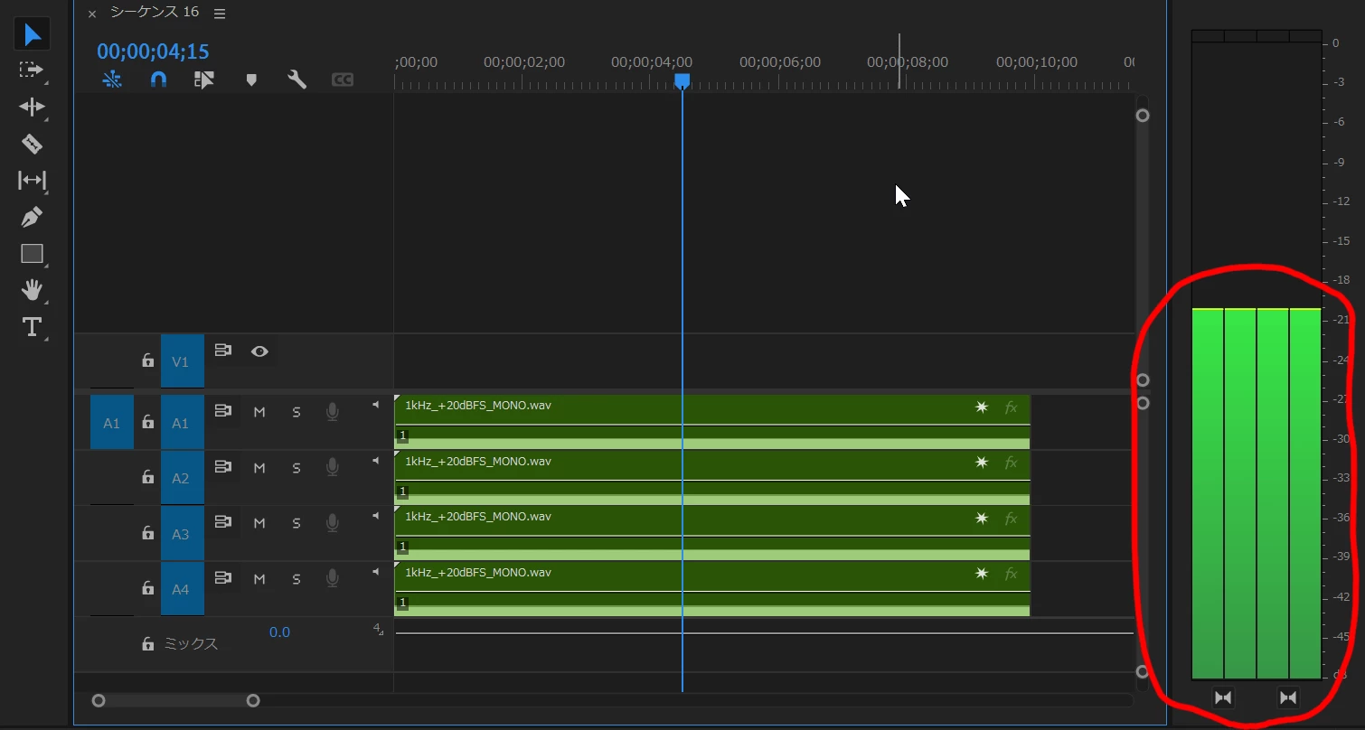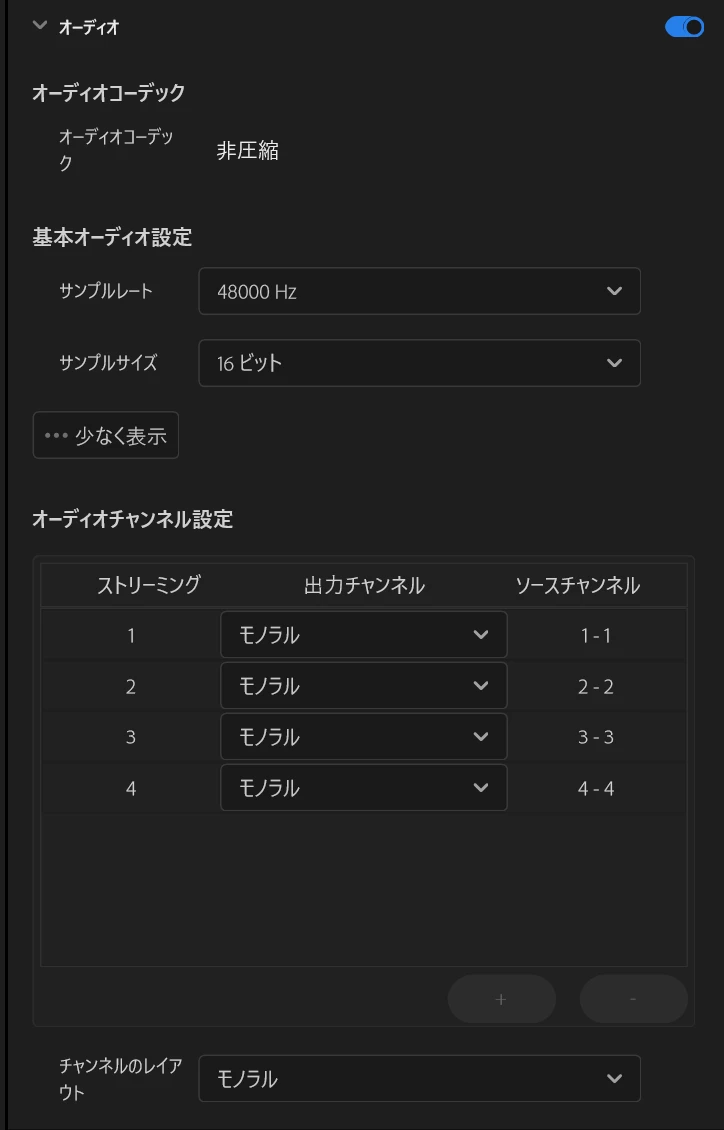 この状態で書き出すと「モノラルの音声4個が入った4chの音声が1ストリーム」として書き出され、少なくともPremiere Proで読み込んだ場合にはモノラル×4として認識されるので、特に支障はないのではないかなと思います。