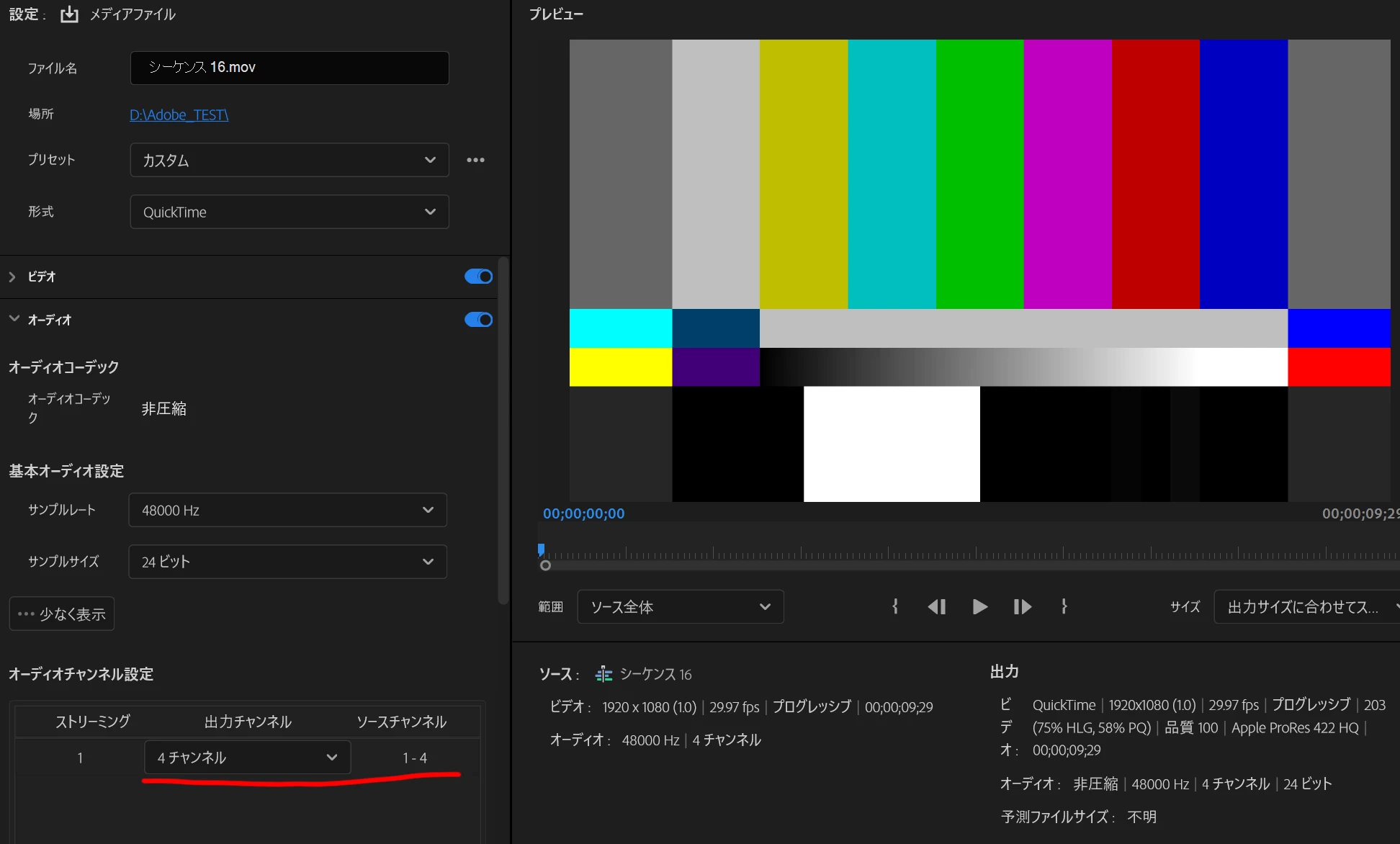 premiere proで4ch音声の動画を書き出したいです。