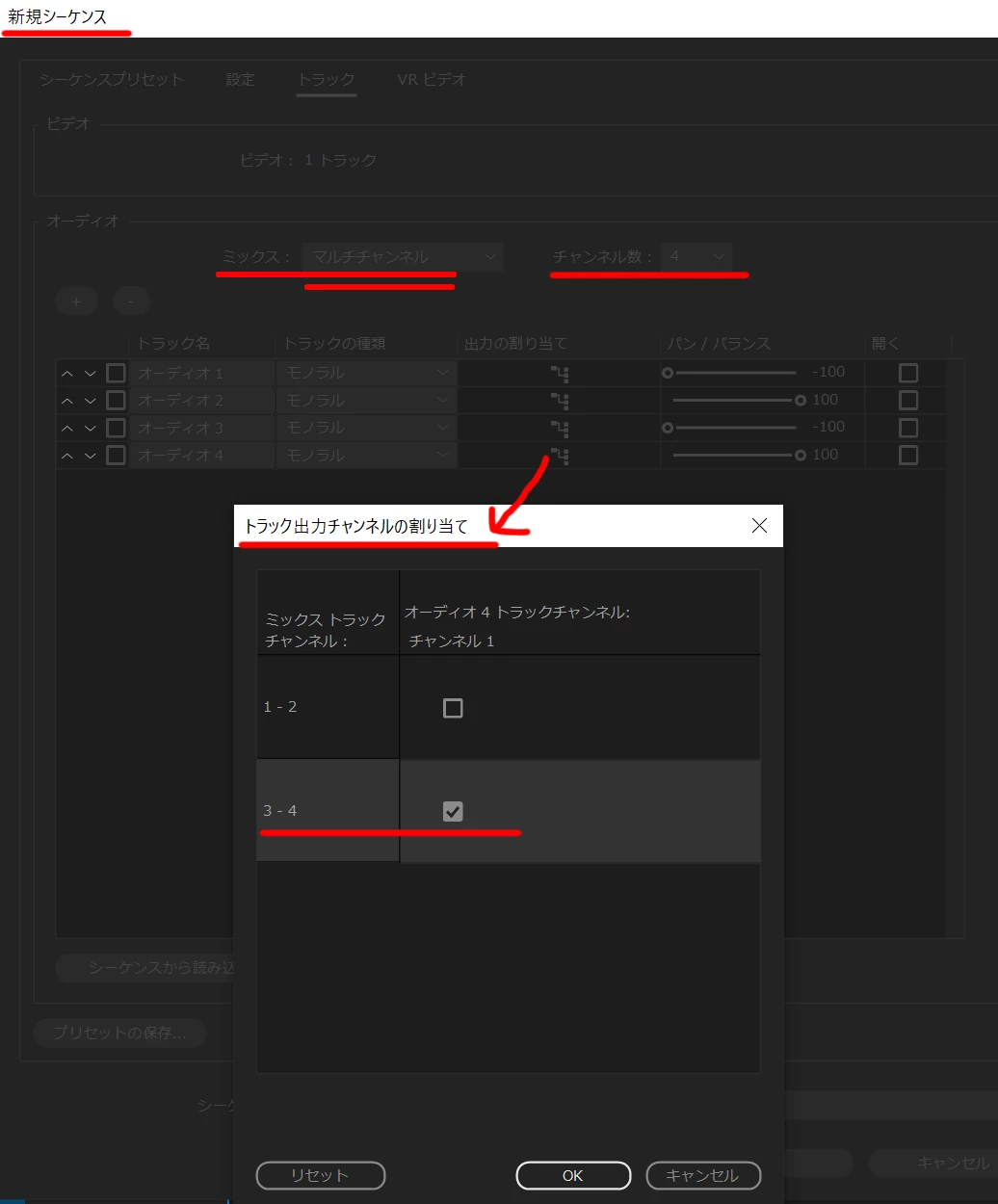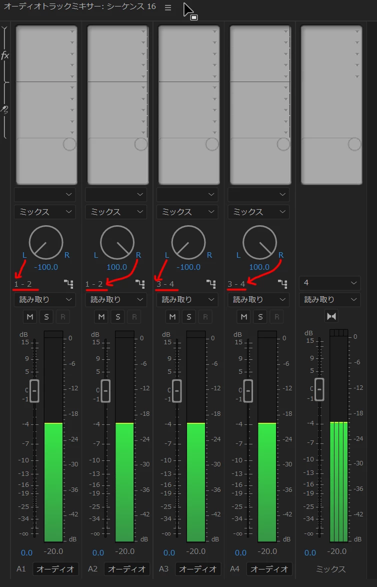というのも、シーケンス作成時の出力割り当てに1-2や3-4という設定しか無かったり、オーディオトラックミキサーのトラック出力設定にミックスという選択肢しかなかったり、調べた方法通りに操作ができなかったりします。