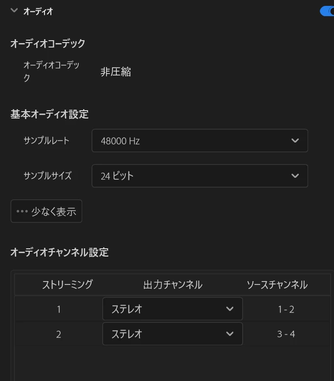 余談になりますが、ステレオ音声2つ(デュアルステレオ)で書き出す場合は、下記画像のようになります。